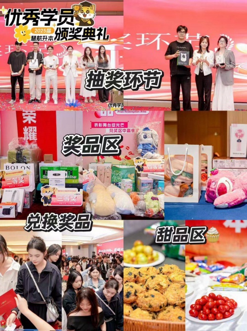 大会的最后,迎来了最激动人心的兑奖领奖环节。除了优秀学员的奖学金外,现场还准备了多轮抽奖活动,丰厚的奖品涵盖学习用品、生活用品、电子产品等,超多大奖让学员们期待不已。随着一个个中奖号码的公布,幸运学员们陆续上台领取奖品,现场欢呼声、尖叫声此起彼伏,每个人的脸上都洋溢着幸福的笑容,整场大会在欢乐与惊喜的氛围中圆满落幕。
